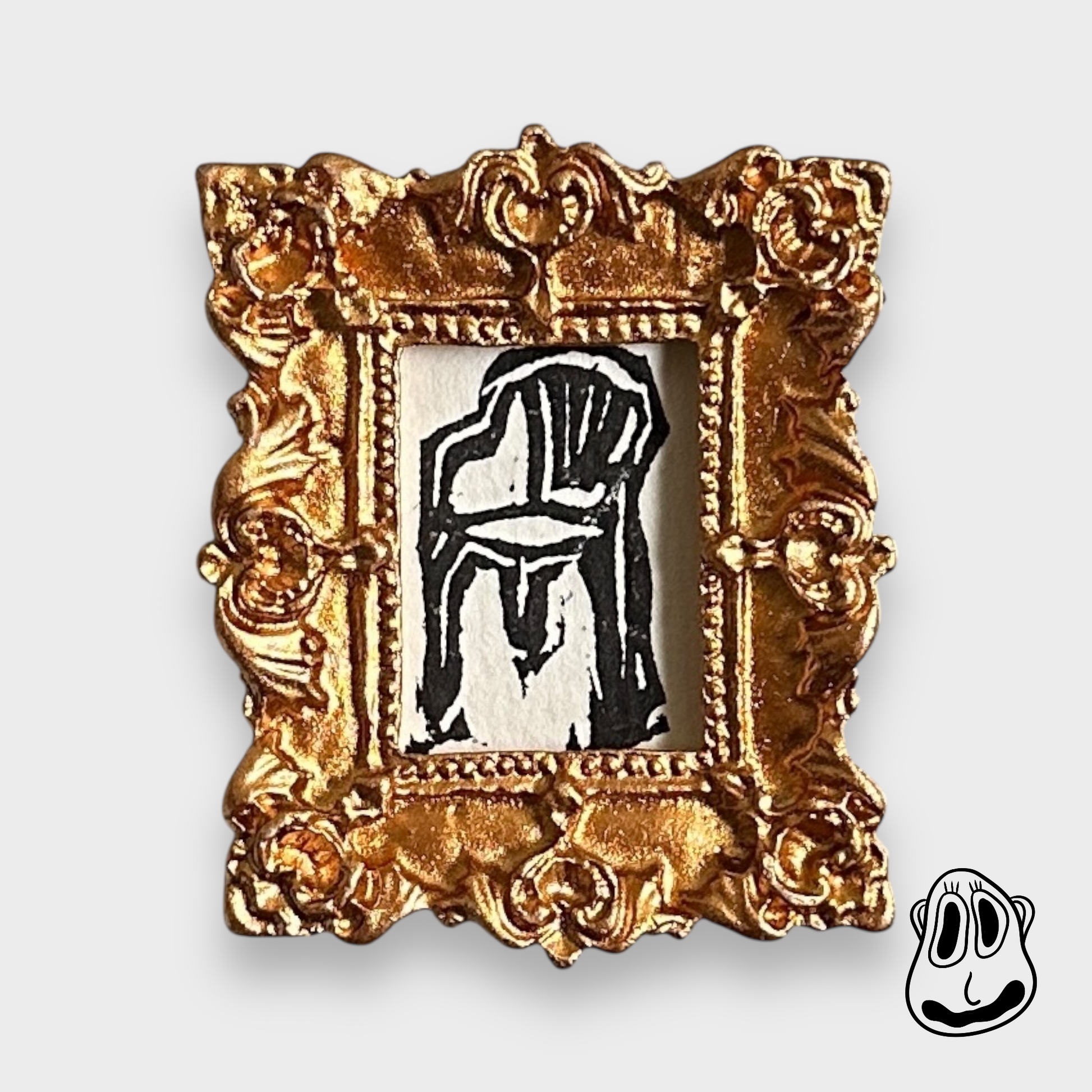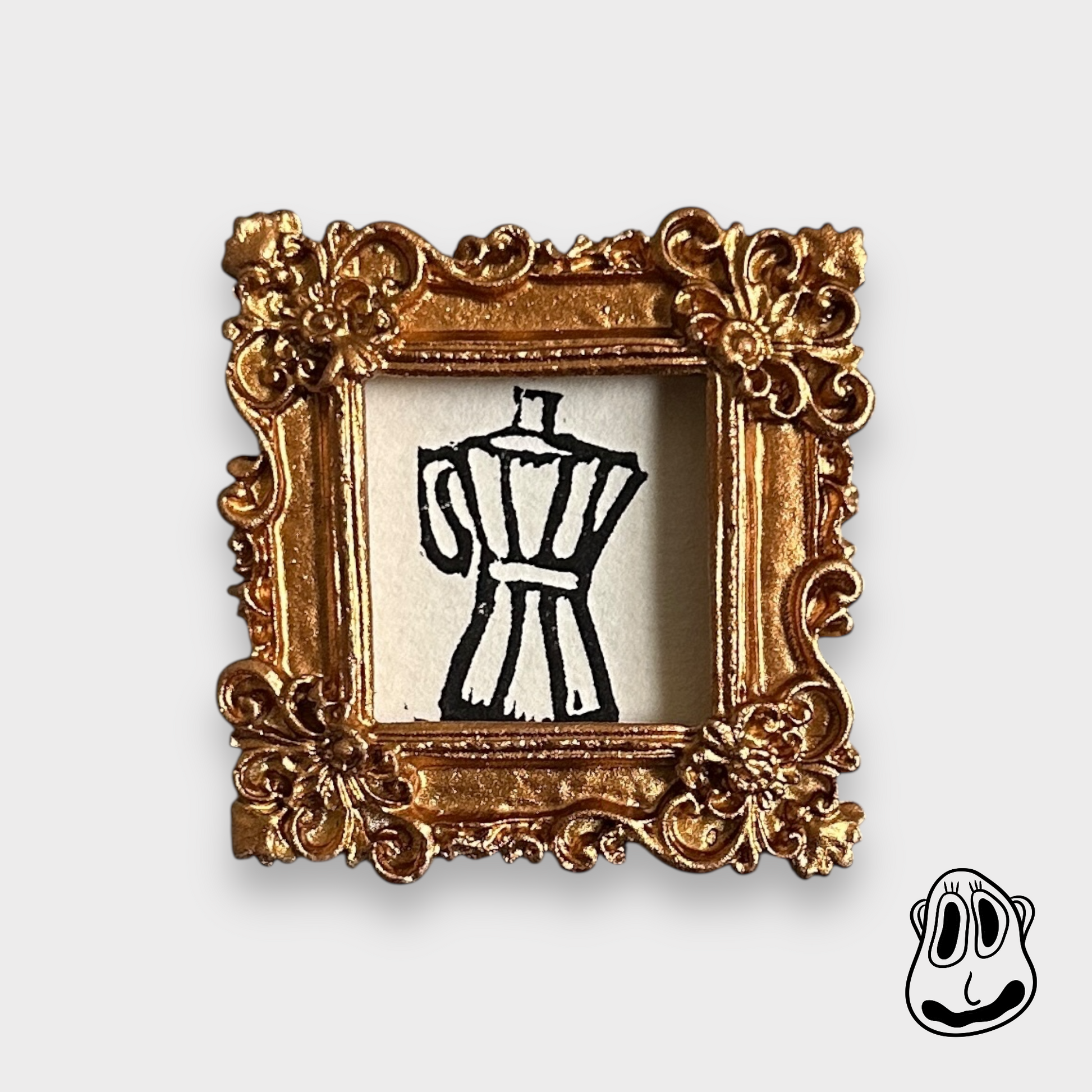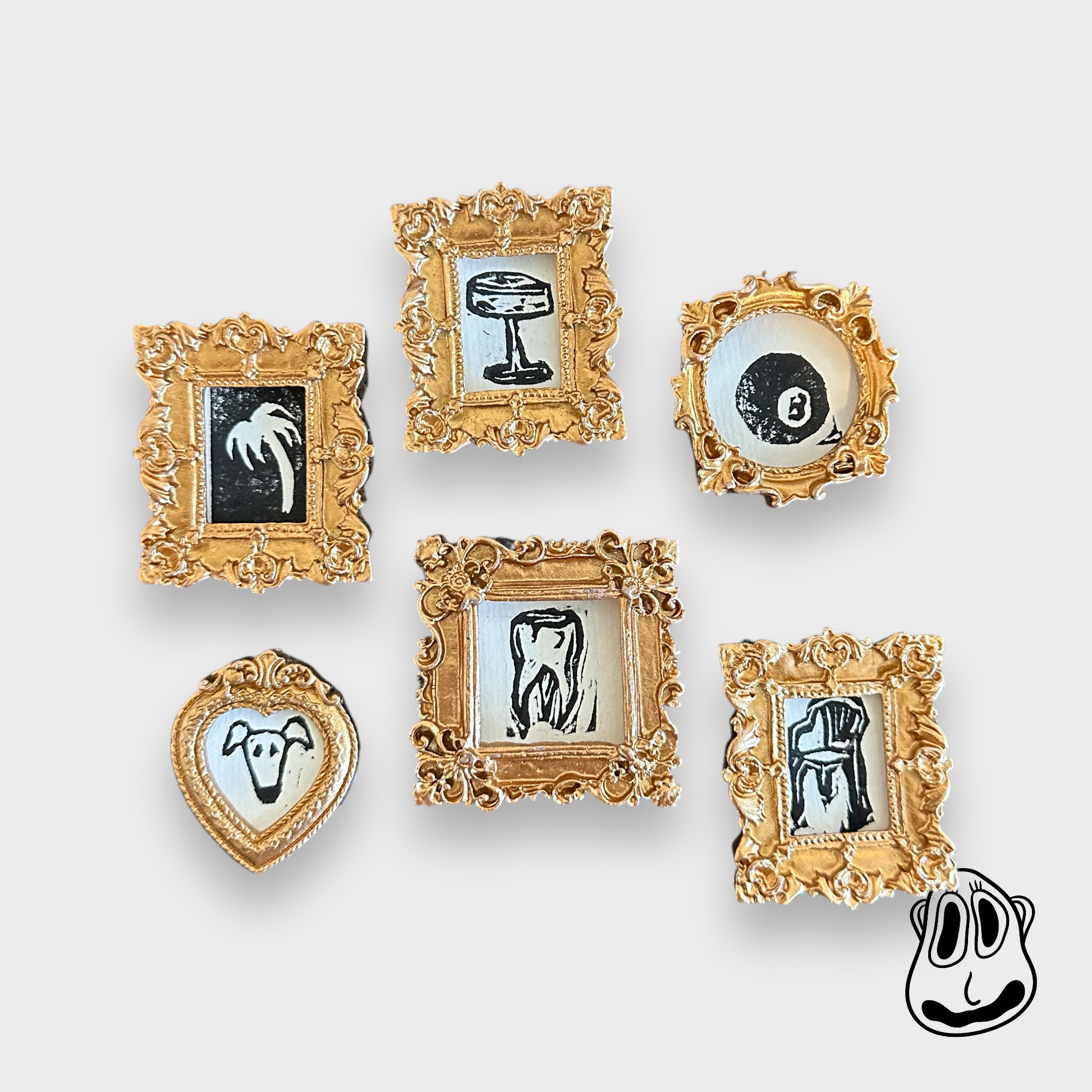 Add some elegance and whimsy into your life (or the front of your refrigerator) with these mini framed lino print magnets! Each mini stamp was designed and carved by hand, stamped onto a mini sheet of quality paper, and then attached to a gold frame with an added magnet backing.