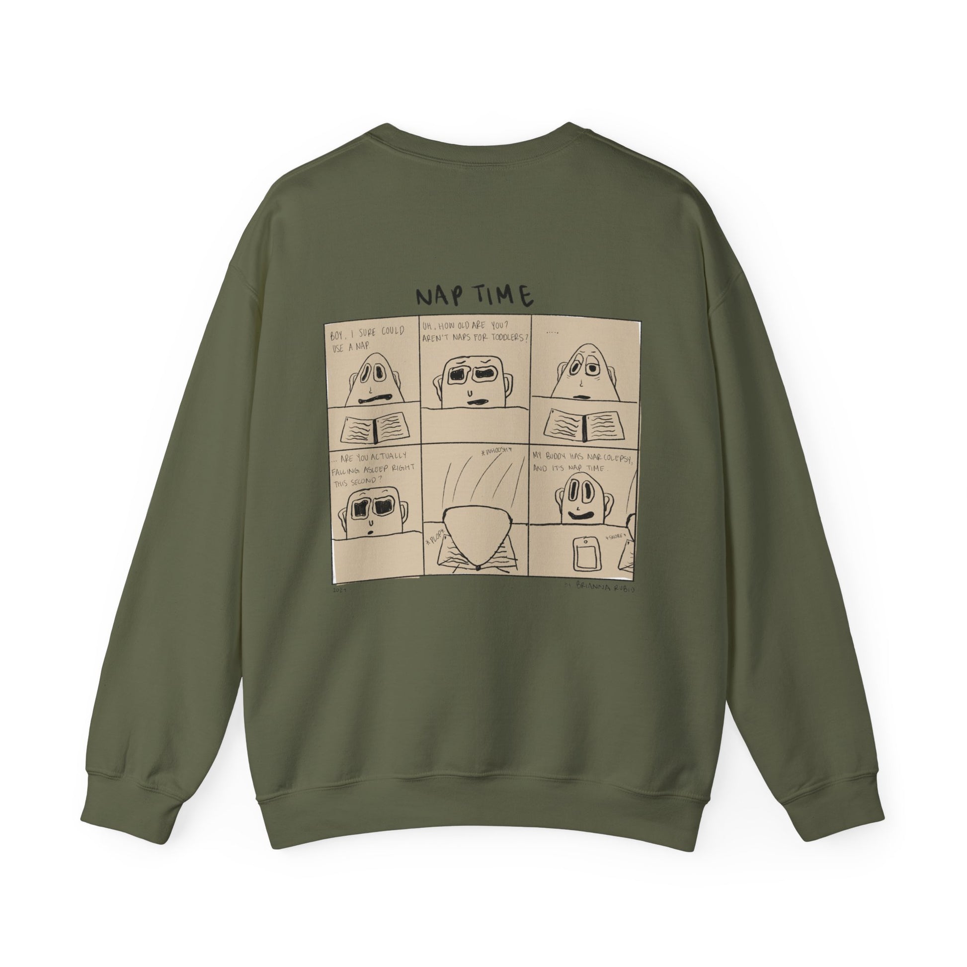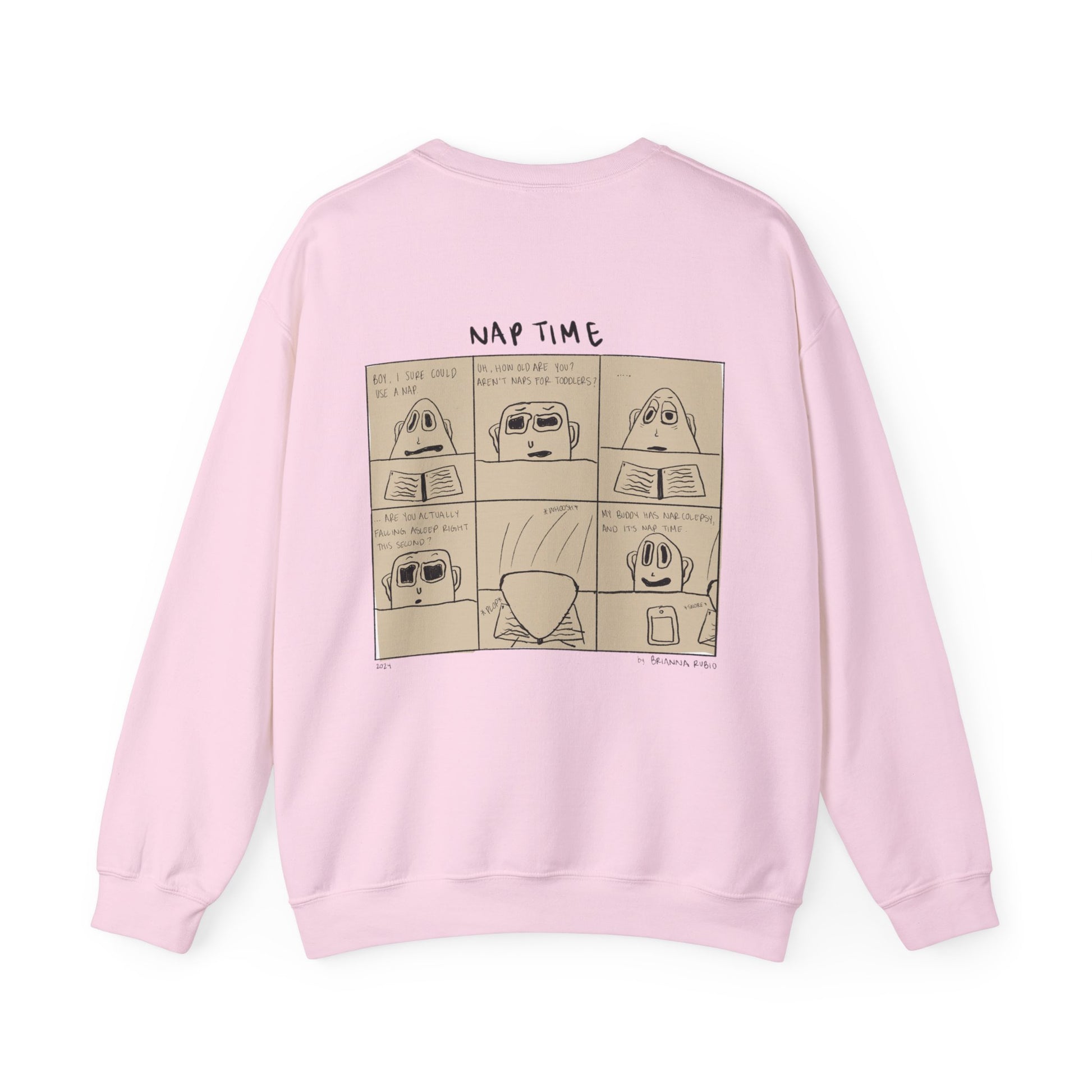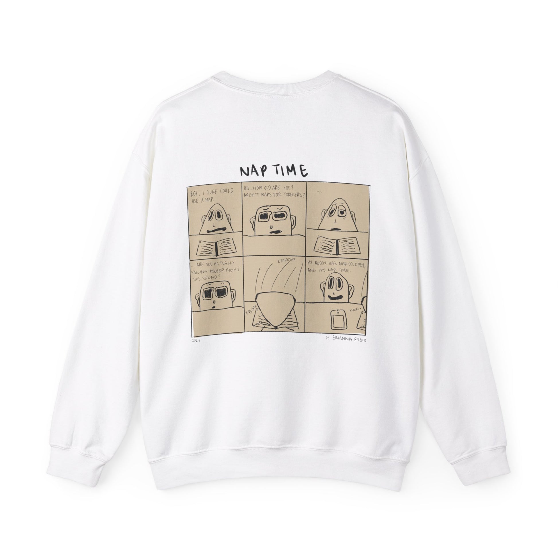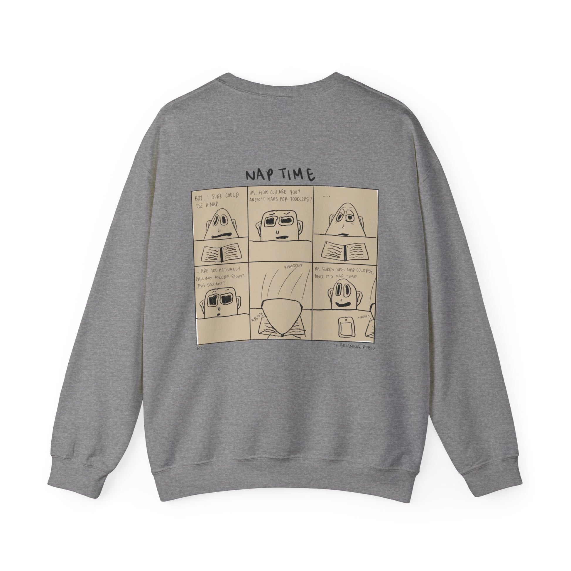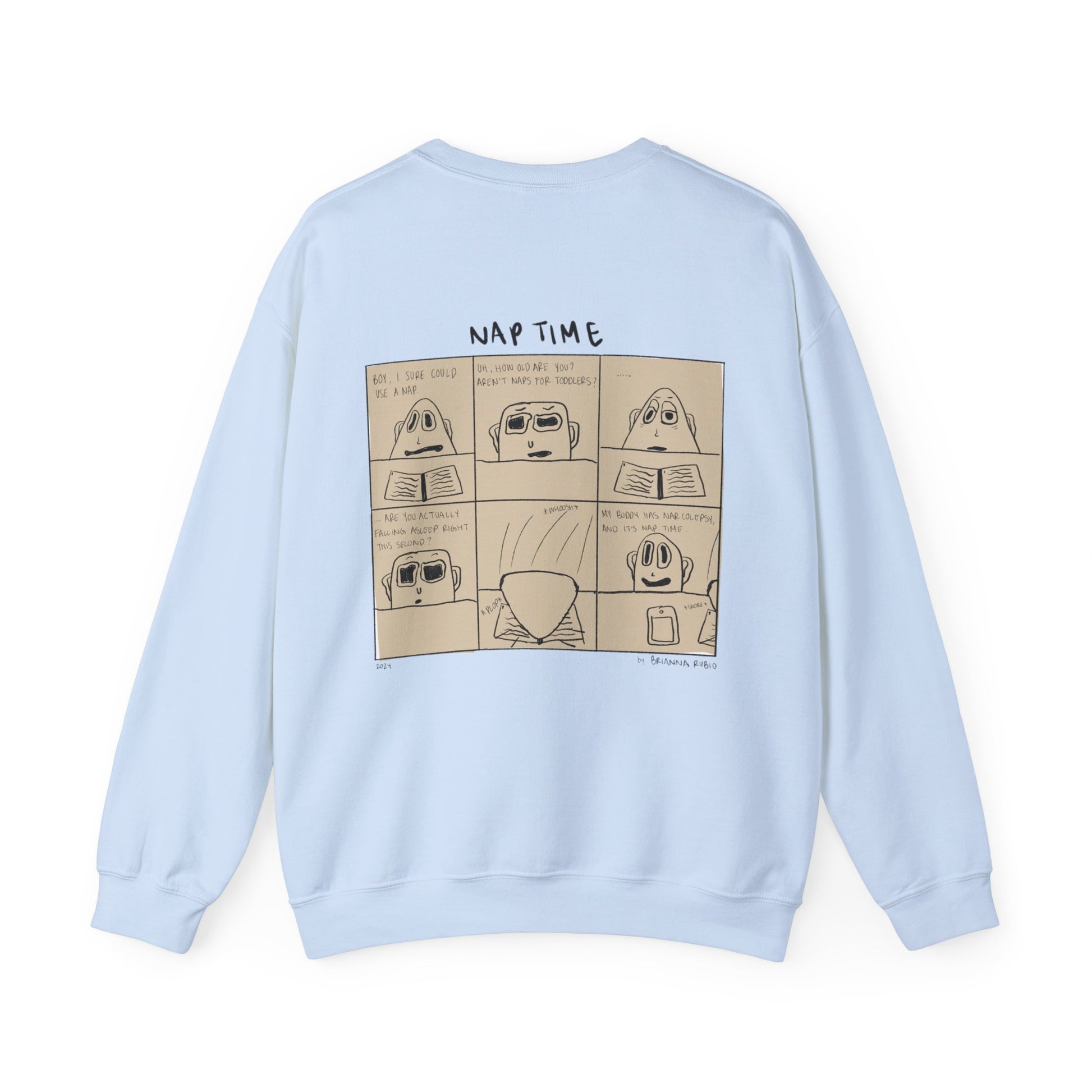 "Nap Time", and original comic by me. This crewneck is part of my narcolepsy awareness collection to share my experience as a person living with narcolepsy. Narcolepsy is a neurological condition that impairs the brain's ability to regulate the sleep-wake cycle.
