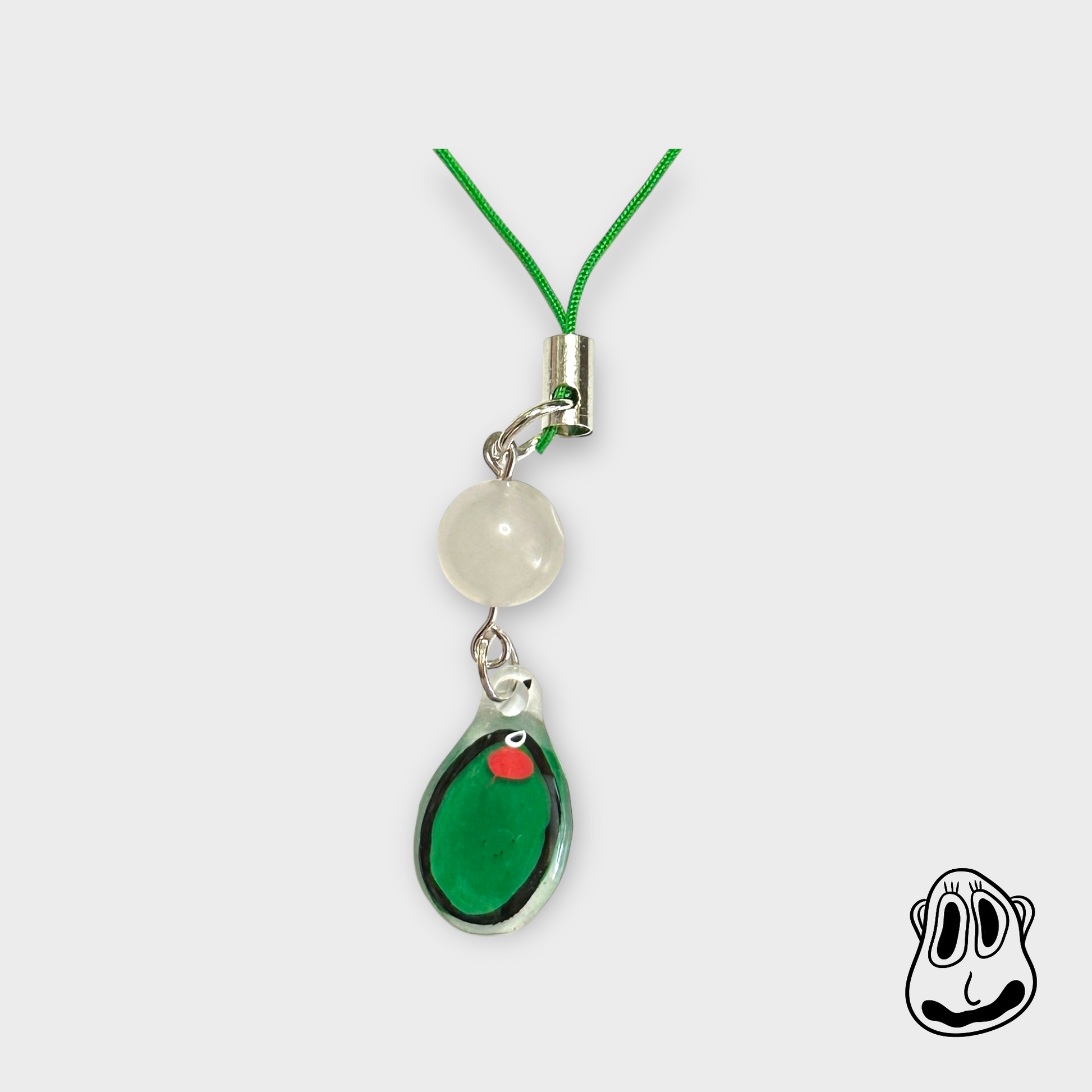 The olive charm was made entirely by hand using shrink plastic and coated in resin for added durability. After adding some beads and a charm cord, this phone charm is ready to go to a loving home!